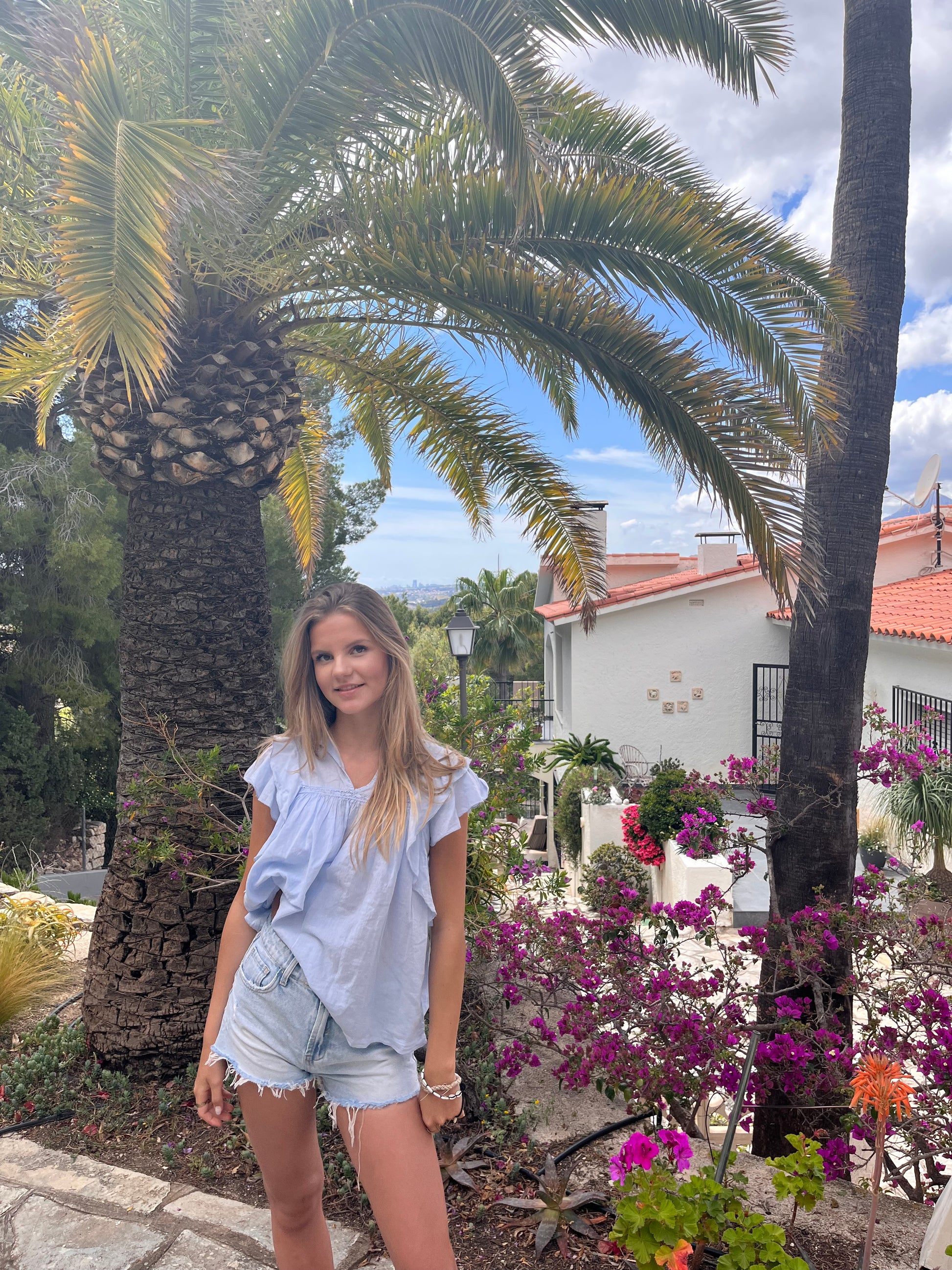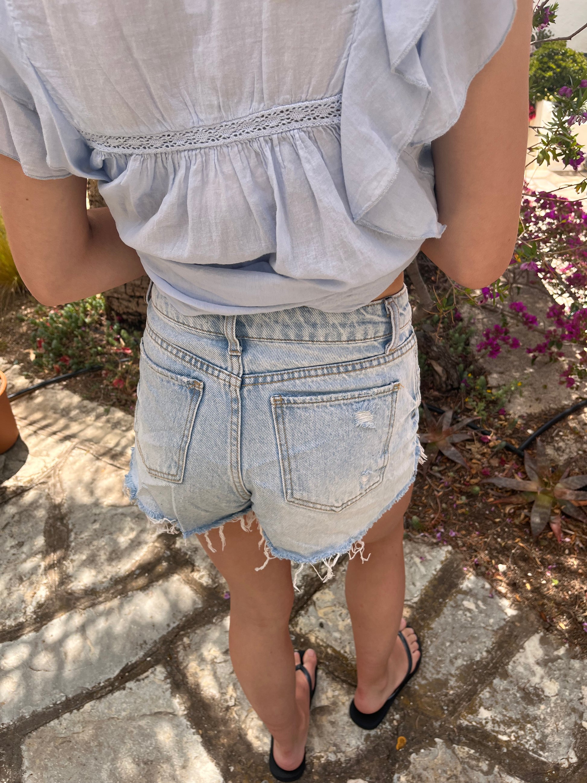 Phi draagt hier onze jeans short in een mooie lichtblauwe wassing. Phi draagt maat S.